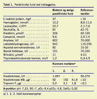 En 71-årig mand med paroksystisk atrieflimren blev indlagt med flankesmerter. Han kastede op, havde svedeture og feber (temperatur 38,5 °C). Blodtrykket var 130/80 mmHg. Der var lungestase. Man fandt forhøjede koronarenzymer, leukocytose og tegn på påvirkning af lever og nyrefunktion (Tabel 1 ). Et elektrokardiogram (ekg) viste hurtig atrieflimren med svag R-taks-progression. Man gav antibiotika på mistanke om sepsis. Urin- og bloddyrkninger var negative. Blodtrykket faldt til 90/65 mmHg. Et ekkokardiografi viste dilateret venstre ventrikel med kontraktilitet begrænset til basale segmenter, uddrivningsfraktion (EF): 10-15%. Koronarangiografi viste normale kranspulsårer. Man påbegyndte antikongestiv behandling med diuretika, β -blokker og angiotensinkonverterende enzym (ACE)-hæmmer og patienten kom sig på ca.halvanden måned.