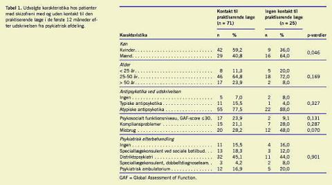 Materiale og metoder: Studiepopulationen omhandler 96 patienter, der opfylder International Classification of Diseases and related Health Problems ' (ICDs) kriterier for skizofreni eller skizoaffektiv sygdom. Patienterne blev interviewet ved indlæggelsen og udskrivelsen fra Psykiatrisk Afdeling. Patienternes egen læge blev bedt om at besvare et spørgeskema seks og 12 måneder efter udskrivelsen. Skemaet, der blev besvaret af 37 praksis, indeholdt oplysninger om, hvorvidt de havde haft kontakt med den enkelte patient, og hvilke ydelser patienten havde modtaget. Herudover blev der indhentet registeroplysninger, som omhandlede indlæggelsesmønsteret de første 12 måneder efter udskrivelsen.