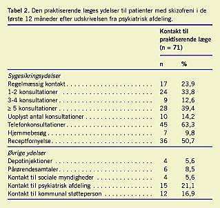 De 96 udskrevne patienter havde gennemsnitligt 3,0 (0-10) konsultationer hos egen læge det første år efter udskrivelsen, men det var imidlertid kun 71 patienter, der havde kontakt, og i Tabel 2 vises, hvilke ydelser de modtog. De 71 patienter havde gennemsnitligt 4,2 (1-10) konsultationer, og knap en fjerdedel havde regelmæssig kontakt. Over halvdelen af patienterne havde herudover telefonkonsultationer og fik fornyet recepter. Det fremgår af tabellen, at den praktiserende læge specielt havde et samarbejde med den psykiatriske afdeling, herunder distriktspsykiatrien.