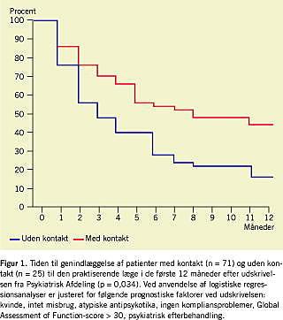 Resultater: Flertallet (73,9%) af patienterne havde kontakt med egen læge efter udskrivelsen, og de havde samme antal konsultationer som baggrundsbefolkningen. Konsultationerne omhandlede primært somatiske problemer, men knap 25% havde psykiske problemer som væsentligste tema. Færre patienter med kontakt blev genindlagt i forhold til patienter uden kontakt (54,9% versus 84,0%, p = 0,034). De patienter, der havde kontakt, forbrugte gennemsnitligt 39 psykiatriske sengedage, og patienter uden kontakt forbrugte 96 sengedage (p = 0,013). Efter justering for prognostiske faktorer var den signifikante forskel fortsat til stede.