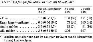 Indlæggelsesmåden var stærkt relateret til, hvor hurtigt patienten ankom til hospitalet. Patienter, der blev indlagt via »112« ankom mediant 1,0 timer (spændvidde 0,5-39,3 timer) efter debut, og heraf ankom 65% inden for tre timer, og 81% inden for seks timer. Patienter, der blev indlagt via egen læge/vagtlæge, blev indlagt mediant 6,0 timer (spændvidde 0,5-169 timer) efter debut. Heraf ankom 21% inden for tre timer og 42% inden for seks timer.