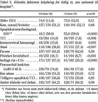 Faktorer af betydning for tidlig/sen ankomst til hospitalet: En univariat sammenligning af de faktorer, der er angi- vet i Tabel 3 , viser, at følgende faktorer var signifikant associerede til tidlig/sen ankomst til hospitalet: Om patienten havde afasi (p<0,007), apopleksiens sværheds-grad (p<0,0001), om patienten vidste, hvad der var i vejen (p<0,001), om patienten havde intracerebralt hæmatom (0,003) eller TCI (p<0,006), om bevidsthedsniveauet var påvirket (p<0,001), og om patienten blev indlagt via »112« (p<0,0001). Alder, køn, præmorbid funktionsniveau (Rankin), ægteskabelig status (gift/samboende eller enlig), forekomst af parese, tidligere apopleksi/TCI og om nogen var til stede eller ej ved debut af symptomerne var ikke associeret til tidlig/sen ankomst til hospitalet. I denne opgørelse er inkluderet patienter, om hvem man med sikkerhed vidste, at de ankom ≤ 6 timer efter debut hhv. >6 timer efter debut, selv om den præcise forsinkelse i timer ikke kunne angives. Hos 39 patienter kunne ankomst før hhv. efter seks timer således ikke angives.