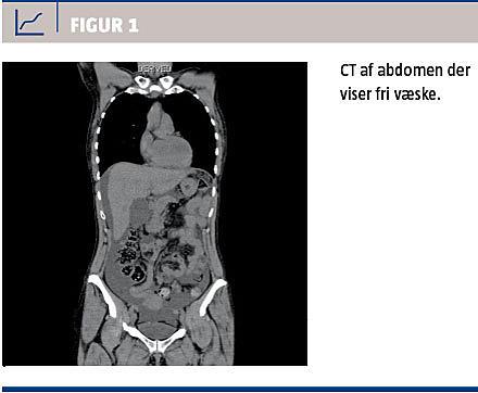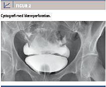 En 54-årig sund og rask kvinde faldt bagover under en dans og fik sin dansepartner på ca. 80 kg ned over sig. Partneren landede nedadtil over kvindens mave, og hun fik senere på natten stærke smerter i maven og blev tilset af en vagtlæge, der fandt let makroskopisk hæmaturi, hvorfor hun blev indlagt på en akutafdeling. Da kreatininmålingen viste 230 mikromol/l, blev der foretaget en CT uden kontrast. CT’en viste umiddelbart ingen skade på nyrerne, men der sås fri væske omkring blæren, og væsken strakte sig mod leveren og højre nyre (Figur 1). Væsken blev beskrevet som ascites af uklar genese af den vagthavende radiolog, som også konstaterede en uskadt lever og milt. På grund af den makroskopiske hæmaturi og smerterne i maven valgte man at overflytte patienten til en urologisk afdeling. Ved ankomsten blev der glat anlagt kateter à demeure, silikonekateter Ch16/8, efter at blæren blev skannet til 179 ml. Kateteret fungerede med hæmaturi grad 1-2, og der udtømtes straks 2 l urin. Der blev bestilt cystografi for at finde ud af, om der var blæreperforation. Cystografien viste blæreperforation, sandsynligvis intraabdominalt (Figur 2). Der blev foretaget åben eksploration, hvorved der blev fundet en 5 cm stor defekt i blæretoppen i ca. 5 cm afstand fra begge ostier. Defekten blev lukket intravesikalt, hvorefter blæreforvæggen blev lukket i to lag. Patienten blev behandlet med åbentstående kateter i tre dage og blev udskrevet til hjemmet i velbefindende på tredje postoperative dag.