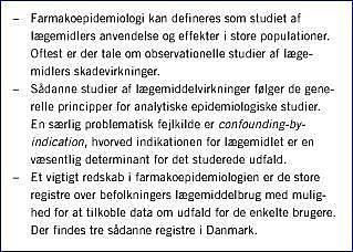 Farmakoepidemiologi kan defineres som studiet af lægemidlers anvendelse og effekter i store befolkningsgrupper [1]. Oftest er der tale om en brug af epidemiologiske metoder til belysning af klinisk farmakologiske problemstillinger, typisk spørgsmål om forholdet mellem virkninger og bivirkninger og om rationel lægemiddelbrug. En række lægemidler, for eksempel statiner, gives til raske med henblik på at forebygge sygdomme. Dette stiller betydelige krav til kendskab til virkningsprofilen.