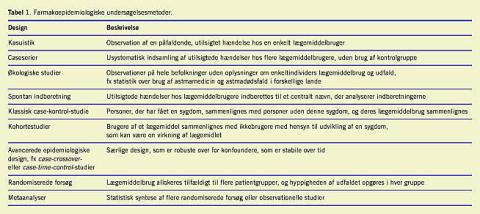 Lægemiddelvirkninger kan studeres i randomiserede og nonrandomiserede (observationelle) design. Ved randomiserede studier fordeles lægemiddel og placebo ved lodtrækning, og man vil i princippet kunne antage, at de personer, som har fået lægemidlet, er sammenlignelige med dem, som ikke har fået det. I modsætning hertil vil man i det observationelle studie lade personerne og deres behandlere selv afgøre, om patienten skal behandles eller ej. Forskeren vil skaffe oplysninger om deltagernes lægemiddelbrug uden at påvirke det aktivt og vil observere forekomsten af utilsigtede hændelser hos brugere vs. hos ikkebrugere af lægemidlet. De to hyppigst anvendte studiedesign er kohorte- og case-kontrol-designet. I et kohortestudie sammenlignes brugere og ikkebrugere af lægemidlet (eller brugere af forskellige lægemidler), og incidensen af en given utilsigtet hændelse, f.eks en mavesårsblødning, opgøres i hver gruppe. I det klassiske case-kontrol-studie vil man sammenligne personer med en given sygdom, f.eks. blødende mavesår, med en kontrolgruppe uden denne sygdom. Lægemiddelekspositionen opgøres for de to grupper. Hvis lægemidlet er en årsag til sygdommen, vil der alt andet lige være flere brugere blandt de syge end blandt personerne i kontrolgruppen [18], og fordelingen de to grupper imellem indikerer styrken i relationen mellem lægemidlet og virkningen. I nyere teknikker som f.eks. case-base-studiet og nested case-kontrol-studiet udnyttes kohortedesignets fordele, men med et mindre behov for materiale. En nærmere redegørelse for argumentationen bag disse teknikker vil falde uden for denne artikels rammer. Der kan henvises til standardværker [19].