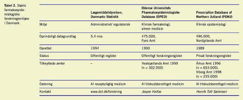 Der er tre større forsknings- og udviklingsmiljøer i Danmark, hvor man beskæftiger sig med farmakoepidemiologi (Tabel 2 ). Prescription Database of Northern Jutland, PDNJ og Odense Universitets Farmakoepidemiologiske Database, OPED, har eksisteret siden 1989 og 1990 og dækker henholdsvis Nordjyllands og Fyns Amter (population henholdsvis 496.000 og 475.000). I databaserne er der indsamlet oplysninger om samtlige indløsninger af tilskudsberettiget medicin. Hver receptpost indeholder CPR-nummer, dato for indløsning, apotek, ydernummer og en nøjagtig identifikation af den udleverede vare og mængde. Registrene er baseret på rutinemæssigt indsamlede oplysninger om tilskudsrefusion, som anvendes i afregningen mellem amterne og de enkelte apoteksfilialer. Da oplysninger som indikation og dosering ikke har direkte betydning for tilskudsrefusionen, er disse ikke registreret, ligesom ingen af registrene indeholder data for receptpligtig medicin uden tilskud, f.eks. benzodiazepiner, orale kontraceptiva og visse antibiotika [37]. Begge registre anvendes til såkaldte record-linkage -studier, hvorved receptoplysningerne kobles sammen med oplysninger om udfald, for eksempel fra registre over sygehusindlæggelser. PDNJ er udsprunget af et klinisk epidemiologisk forskningsmiljø. Hovedinteressen har været lagt på studier af lægemiddeleffekter, herunder skadevirkninger af lægemiddelbrug hos gravide og diverse virkninger af NSAID. OPED er udsprunget af klinisk farmakologiske og almenmedicinske forskningsmiljøer og har i videre omfang fokuseret på udvikling af redskaber til belysning af ordinationsmønstre, kvalitetsindikatorer og interventioner. Kontaktpersonerne for forskere, der måtte ønske at gøre brug af registrene, er denne artikels to forfattere.