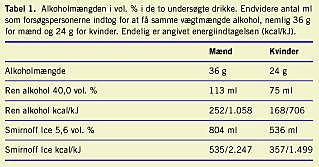 For at få samme vægtmængde alkohol fra de to forskellige produkter var der stor forskel på de indtagne volumina. Deltagerne fik 15 min til at indtage de forskellige alkoholiske drikke. Dette var nødvendigt pga. de meget varierende volumina. De indtagne mængder alkohol og energiindholdet i de to drikke ses i Tabel 1 . Producenten har oplyst, at totalsukkermængden for Smirnoff Ice er 88 g/l (manglende deklaration). For ren alkohol er totalsukkermængden nul. Sukkerindholdet i Smirnoff Ice består af sukrose, som allerede i flasken i mindre grad spaltes til fruktose og glukose i henhold til firmaoplysninger.
