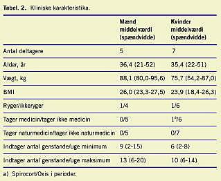 Den kliniske tilstand før inklusionen var tilfredsstillende hos alle deltagerne. En person havde en let astma. Paraklinisk viste alle laboratorie prøverne normale forhold i undersøgelsesforløbet. I Tabel 2 vises de kliniske karakteristika for forsøgspersonerne. Alle deltagerne havde et ugentligt alkoholforbrug, som var mindre end Sundhedsstyrelsens anbefalinger.