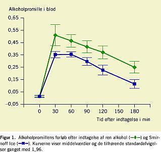I Figur 1 vises de opnåede alkoholkoncentrationer ved indtagelse af ren alkohol og Smirnoff Ice hos fastende. På et hvilket som helst tidspunkt i undersøgelsesforløbet var der signifikant forskel i de opnåede alkoholpromiller i plasma (p < 0,01), idet indtagelse af Smirnoff Ice gav en fladere kurve. Under eliminationen forløber de to kurver parallelt.