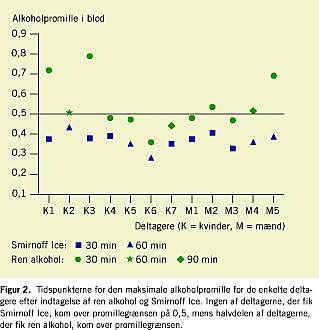 I Figur 2 vises, at ingen af deltagerne nåede op over promillegrænsen for bilkørsel på 0,5 ved indtagelsen af Smirnoff Ice. Ved indtagelse af ren alkohol var halvdelen over promillegrænsen på et tidspunkt under forløbet (Figur 2).