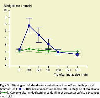 Materiale og metoder: I en klinisk kontrolleret undersøgelse blev virkningen af Smirnoff Ice og ren alkohol undersøgt hos tolv raske, fastende forsøgspersoner. Der blev taget blodprøver til alkohol- og blodsukkerbestemmelser til tiden 0 min, 30 min, 60 min, 90 min, 120 min og 180 min. De deltagende mænd fik 36 g alkohol, mens kvinderne fik 24 g alkohol.
