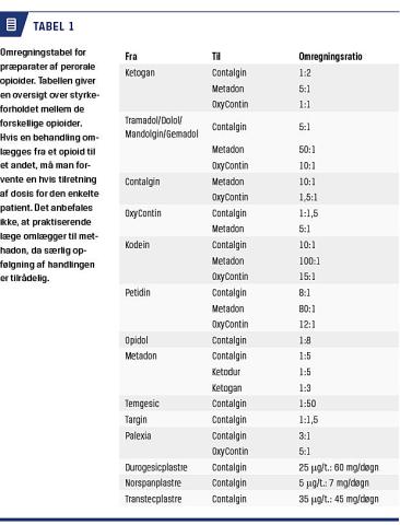 eller morphinækvivalenter [14] bør være undtagelsen (Tabel 1). Problemer som kognitiv dysfunktion og tilvænning er hyppige [16], og patienterne bør følges med jævne mellemrum, så længe behandlingen med opioider pågår. Opioidbehandlede patienter med smerter bør kontrolleres hos egen læge med 3-6 måneders intervaller med henblik på, om behandlingen stadig har effekt, og om der er opstået generende bivirkninger. Den eneste måde at undersøge for effekt af behandlingerne på er ved langsomt at forsøge at reducere døgndosis. Efter halve til hele års behandling med opioider kan dosis reduceres hos mange.