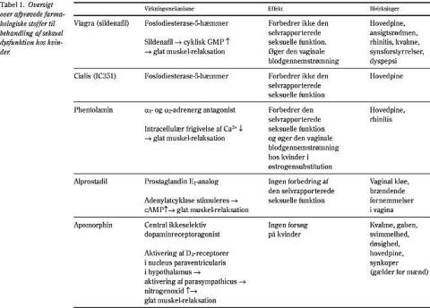 Traditionelt har behandling af FSD primært været i form af sexologisk rådgivning og/eller hormonel behandling (7). I takt med udviklingen af effektiv farmakologisk behandling af erektiv dysfunktion hos mænd har der i de senere år været en stigende interesse for forskningen i mulige farmakologiske behandlingsmuligheder af FSD. De farmakologiske stoffer, der er rapporteret afprøvet på kvinder, er Viagra (sildenafil), Cialis (IC351), phentolamin og alprostadil, der alle virker perifert. Apomorphin, der virker centralt, er afprøvet ved dyreforsøg. En oversigt over disse farmakologiske stoffer ses i Tabel 1 . De perifert virkende stoffer virker relakserende på de glatte muskelceller og tænkes derved at kunne øge blodtilførslen til vagina og derved øge lubrikationen.