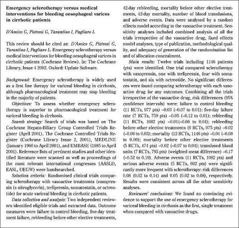 <li>D'Amico G, Pietrosi G, Tarantino I et al. Emergency sclerotherapy versus medical interventions for bleeding oesophageal varices in cirrhotic patients (Cochrane Review). I: The Cochrane Library, Issue 2, 2002. Oxford: Update Software.</li>