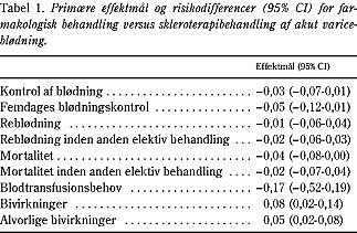 Syv af studierne i Cochrane-analysen blev bedømt til at være af generel god kvalitet, to af intermediær kvalitet og to alene publiceret som abstracts. I alt 27 studier blev vurderet og 15 udelukket, størsteparten på grund af manglende sammenligning mellem skleroterapi og farmakologisk behandling eller inklusion af ikkecirrotiske patienter. I analysen blev de forskellige farmakologiske behandlinger slået sammen. De primære effektmål samt risikodifferencer for farmakologisk behandling versus endoskopisk skleroterapibehandling er angivet i Tabel 1 .