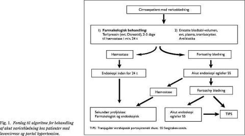 I Fig. 1 er der angivet forslag til behandlingsalgoritme. Cochrane-analysens resultater ført ud i klinisk praksis indebærer farmakologisk behandling straks ved formodning om variceblødning hos en patient med levercirrose samtidig med volumenerstatning af blodtab (blod, plasma expander, evt. saltvand) samt frisk frosset plasma og/eller trombocytter ved mangel herpå. Vi anvender Glypressin som standardbehandling (2 mg som bolus, herefter 1 mg hver sjette time intravenøst). Behandlingen fortsætter i mindst 48 timer, eller til der har været hæmostase i 24 timer. Ved blødning trods behandling med Glypressin foretages der diagnostisk og/eller terapeutisk endoskopi, evt. anlægges der Sengstaken-sonde (SS). Endoskopien kan vente til dagtid, hvis patientens tilstand er stabil. Efter hæmostase overgår patienten til sekundær profylakse (10). Fortsat behandlingssvigt bør medføre fornyet endoskopi og/eller SS samt overvejelser om anlæggelse af TIPS. Profylaktisk behandling med antibiotika (quinoloner) er i en nyere metaanalyse vist at have gunstig effekt på overlevelsen (11).