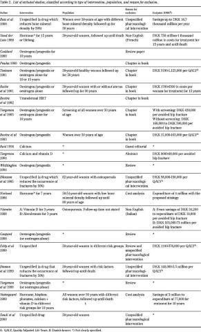 Potentielle CUA- og CEA-studier blev fundet dels ved søgning i MEDLINE (november 1966 til marts 2000) med søgeordene (MeSH) »cost-benefit-analysis and osteoporosis or osteoporosis-postmenopausal«, dels ved gennemgang af referencelister i relevante artikler. Inklusionskriterierne var, at artiklerne skulle være peer reviewed, skandinavisk- eller engelsksprogede samt omhandle CEA- eller CUA-analyser af specifik farmakologisk intervention. Upublicerede studier blev ikke forsøgt opsporet. Hvis to artikler beskrev de samme originale data, blev det mest detaljerede studie inkluderet. Undersøgelserne blev endvidere klassificeret efter typen af økonomisk evaluering (CEA eller CUA) og typen af farmakologisk intervention.