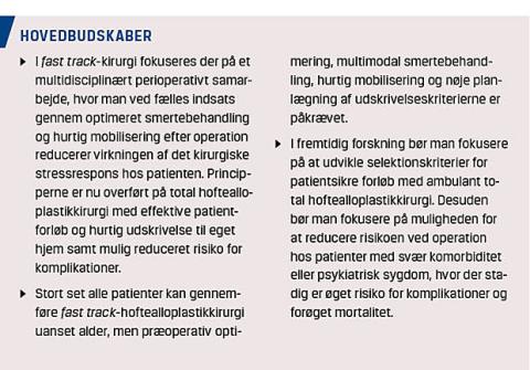 Fast track-THA er et veludviklet koncept med hurtige patientforløb og lav komplikationsrisiko. Det bør være et standardtilbud til alle patienter, der skal have foretaget THA i Danmark og på alle behandlende afdelinger. Individuelle vurderinger og tilpasning af patientforløb hos patienter med svær komorbiditet eller psykiatrisk sygdom er dog stadig påkrævet for at reducere risikoen for komplikationer.