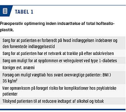 en kohorte på knap 14.000 patienter, der fik fast track-hofte- og -knæoperationer [5]. Diabetes type 2 synes heller ikke at have nogen væsentlig indflydelse på risikoen for komplikationer i form af forlænget indlæggelsestid eller genindlæggelse efter fast track-THA [6], hvorimod risikovurderingen ved type 1-diabetes i et fuldt implementeret fast track-forløb endnu er uafklaret. Indtil da bør man hos disse patienter derfor som ved ikke-fast track-THA have ekstra opmærksomhed på sikring af optimal regulering før operationen og i det perioperative forløb. Præoperativ anæmi øger risikoen for behov for blodtransfusion efter operationen og