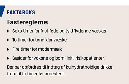 Trods de nuværende rekommandationer er det indtrykket, at en praksis med »faste fra midnat« fortsat anvendes. Meget tyder på, at det er en fordel, at patienten drikker kulhydratholdige tynde væsker frem til to timer inden indledning af anæstesiens. Ved denne fremgangsmåde oplever patienterne mindre tørst, sult og angst, og det er sandsynliggjort, at det reducerer den negative indflydelse af det kirurgiske stressrespons. Der synes at være behov for grundig information af såvel patienter som sundhedsfagligt personale for at få gjort op med traditioner og vaner. Ultralydundersøgelse af mængden og arten af ventrikelindholdet vil formentligt i stigende grad blive anvendt og kan i fremtiden blive en faktor i vurderingen af, hvilken anæstesiologisk induktionsteknik der skal anvendes.