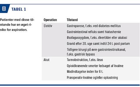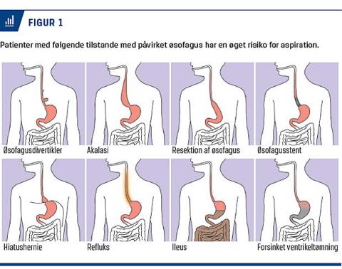 Risikopatienter kan inddeles i dem, der får elektiv, og dem, der får akut kirurgi (Tabel 1). Overordnet kan man sige, at patienter, der har tilstande med påvirket øsofagus (resektion, stent eller divertikler), nedre øsofagussfinkter (refluks, hiatushernie) eller nedsat ventrikeltømningshastighed (ileus, neuropati, graviditet), har en øget risiko for aspiration (Figur 1).