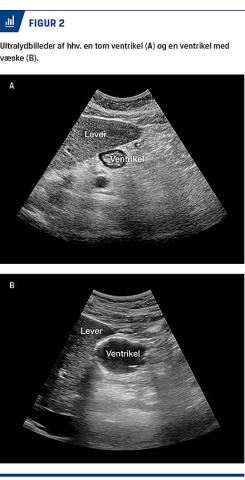 (Figur 2A). Hvis der ses fast materiale, vil aspirationsrisikoen være høj. Såfremt der er væske (Figur 2B), kan mængden estimeres vha. formler, hvor bl.a. tværsnitsarealet af ventriklen og patientens alder indgår [20]. Metoden er imidlertid behæftet med usikkerhed og er stadig under udvikling.