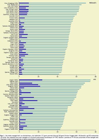 Resultater af vores analyser af mængden af total fedt og transfedt i 74 pommes frites og fried chicken/Nuggets/Hot Wings, måltider købt i McDonald's og KFC-restauranter i 35 lande i 2005-2006, er angivet i Figur 1 . Figuren angiver mængden af total fedt og IP-TFA i 160 gram friturestegt kyllingekød og 171 g pommes frites, hvilket svarer til en stor portion i en amerikansk McDonald's-restaurant. I de analyserede måltider varierede indholdet af totalfedt fra 41 gram til 65 gram hos McDonald's og fra 42 gram til 74 gram hos KFC. Indholdet af IP-TFA varierede fra 0,3 gram til 10,2 gram og fra 0,3 gram til 24 gram hos henholdsvis McDonald's og KFC. Forskellen i mængden af totalfedt kan delvist skyldes lokale smagspræferencer. Det er imidlertid ikke tilfældet for forskellen i indholdet af transfedt, som ikke giver kosten en speciel smag. Resultaterne viser, at det samme produkt fra den samme kæde kan variere i fedtkalorieindhold med mere end 40% og i IP-TFA med adskillige størrelsesordner. Vi påviser således, at det samme måltid uden brugerens viden kan variere meget væsentligt med hensyn til at opfylde rekommandationerne for sund kost.