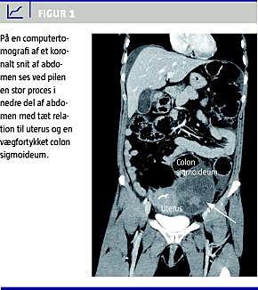 En computertomografi (CT) af abdomen foretaget med intravenøst kontrastmiddel viste fri væske, ødematøs og vægfortykket colon sigmoideum med afsmalning af lumen over ca. 20 cm, en 9 × 8 × 8 cm proces i venstre fossa iliaca i nær relation til ovariet og tre små fokale forandringer i leveren (Figur 1 ).