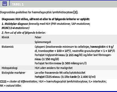 Hæmofagocytisk lymfohistiocytose (HLH) er en sjælden, formentlig underdiagnosticeret sygdom, der er karakteriseret ved immunologisk hyperinflammation [1]. Kardinalsymptomerne er feber, leverpåvirkning, cytopeni og hæmofagocytose. Andre manifestationer er lymfadenitis, ødemer, symptomer fra centralnervesystemet (CNS) og i svære tilfælde multiorgansvigt [2]. Den årlige incidens er angivet til at være 1/800.000 [3]. HLH inddeles i en primær genetisk form og en sekundær form, som udløses af infektion, autoimmun sygdom, immunsuppression eller malignitet. Sekundær HLH udløses hyppigst af Epstein-Barr-virus (EBV).