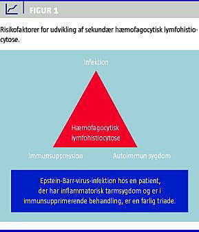 En 22-årig mand med colitis ulcerosa og i behandling med azathioprin blev indlagt på et lokalt sygehus på mistanke om mononukleose. Sygdommen var begyndt to uger forinden i form af feber og halssmerter, og patienten var gennem en uge blevet behandlet med penicillin og metronidazol uden effekt. Ved indlæggelsen var der knoglemarvssuppression (hæmoglobin 7,9 mmol/l, leukocytter 2,3 × 10 9 /l og trombocytter 89 × 10 9 /l). Fire måneder før indlæggelsen var knoglemarvsfunktionen normal. Patienten blev udskrevet efter en dags indlæggelse med pausering af azathioprin, men blev tre dage senere genindlagt med forværret almentilstand. Der blev konstateret mononukleose med svært hypertrofiske tonsiller, og patienten blev henvist til Øre- næse- og halskirurgisk Klinik, Rigshospitalet, med henblik på akut tonsillektomi. På grund af stridor blev han intuberet og overflyttet til Intensiv Afdeling, Rigshospitalet, (dag et). Han var cerebralt påvirket, højfebril, med universel glandelsvulst og svær knoglemarvssuppression (hæmoglobin 5,9 mmol/l, leukocytter 1,1 × 10 9 /l og trombocytter 29 × 10 9 /l). Tilstanden blev tolket som sekundær bakteriel infektion til mononukleose hos en immunsupprimeret patient, og behandling med bredspektrede antibiotika (meronem, ciproxin og metronidazol) samt granulocytkolonistimulerende faktor (knoglemarvsstimulation) blev påbegyndt. Dag to fik patienten akut respiratorisk distresssyndrom og dissemineret intravaskulær koagulation. Han havde biokemisk svært forhøjet ferritinniveau (12.300 mikrogram/l) og forhøjet triglyceridniveau (2,31 mmol/l), hvilket sammen med knoglemarvssuppression og hepatosplenomegali udløste diagnosen HLH (Tabel 1 ). Der blev påbegyndt behandling med immunkemoterapi i overensstemmelse med de terapeutiske retningslinjer for HLH. En knoglemarvsbiopsi taget på dag fire understøttede diagnosen. Under indlæggelsen var patienten i kontinuerlig behandling med bredspektret antibiotika og i systemisk svampebehandling. Der var talrige tilsyn fra hhv. Hæmatologisk, Øre-næse-halskirurgisk, Gastrokirurgisk og Mikrobiologisk Afdeling. Patienten fik undervejs pneumomediastinum/pericardium, ascites, begyndende nyresvigt og gastrointestinal blødning. Under indlæggelsen blev der udført tonsillektomi og trakeotomi. På trods af intensiv behandling døde patienten på 17.-dagen efter fund af nekrotisk henflydende øsofagus. Antallet af kopier ved EBV-PCR (virus- load ), som afspejler prognosen ved EBV-HLH, var 840.000 kopier/ml på dag to, 33 mio. kopier/ml på dag fire og 57 mio. kopier/ml på dag ti. Immundefektudredning udelukkede primær/genetisk årsag til HLH.