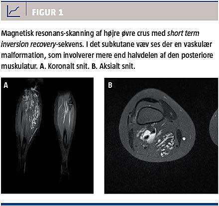 En seksårig pige, der var tidligere rask, blev henvist til en ortopædkirurgisk afdeling pga. hypertrofi af højre crus. Objektivt sås en omfangsforøgelse af højre crus på 4 cm sammenlignet med venstre crus, men ellers fandt man normale forhold ved den kliniske undersøgelse. En magnetisk resonans (MR)-skanning viste en omfattende subkutant beliggende vaskulær malformation, som inddrog muskulaturen på højre crus (Figur 1). Kompressionsbehandling blev påbegyndt.