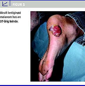 En 37-årig kvinde blev henvist fra en dermatolog med henblik på excision og viderebehandling af et ALM på højre laterale fodrand. Melanomet strakte sig ind under hælen. Tumoren, der havde et omfang på 4 × 4,5 cm, fremstod amelanotisk med let randpigmentering (Figur 1 ). Elementet havde udviklet sig over tre år fra at være en lille rød plet til at blive et større sår. Patientens praktiserende læge behandlede primært forandringen som eksem. Senere påbegyndte den praktiserende dermatolog behandling mod svampeinfektion. Først efter mere end to års ineffektive behandlinger blev såret biopteret, og diagnosen ALM blev stillet. Patienten blev henvist til en plastikkirurgisk afdeling, hvor melanomet blev excideret med en margen på 2 cm, og defekten blev dækket af et fuldhudstransplantat. Melanomet var ulcereret, målte 11 mm i tykkelse og havde penetreret til subcutis ( Clark's level 5). Der blev foretaget sentinel node -biopsi fra den samsidige lyske. Alle sentinel nodes (3 stk.) viste malignitet. Der blev foretaget en positronemissionstomografi, som viste metastasering til lever og lunger. Patienten fik onkologisk efterbehandling, men døde ni måneder efter diagnosetidspunktet.