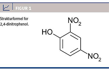 DNP er en kemisk forbindelse, som traditionelt har været anvendt i industrien, og som siden 1930’erne har været kendt som slankemiddel. Stoffet blev imidlertid forbudt i USA i 1938, fordi der registreredes dødsfald i forbindelse med brugen, og dødsraten i forbindelse med stoffet faldt i de efterfølgende årtier. Inden for de seneste 5-10 år har antallet DNP-relaterede forgiftninger og dødsfald været voldsomt stigende [1, 2]. I Storbritannien er der rapporteret om 33 tilfælde i perioden 2007-2013, heraf fem dødsfald [2]. Ved en simpel søgning på Google finder man stoffet omtalt på adskillige hjemmesider, både nationale og internationale, om både dets anvendelse og salg af det. Stoffet er velkendt i bodybuilding-/fitnessmiljøer [2]. Den anbefalede terapeutiske dosis er 200-400 mg/dag [1], hvilket svarer til 5 mg/kg til en person på 80 kilo. Der er imidlertid konstateret DNP-dødsfald allerede ved en dosis på 4,3 mg/kg [1], og der er således overlap mellem terapeutisk og potentielt letal dosis.