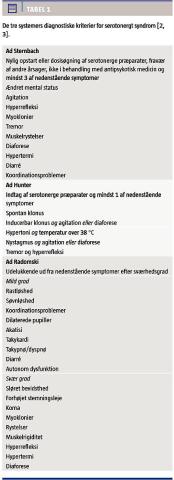 Patienten i sygehistorien opfyldte kriterierne for SS ud fra alle de nævnte modeller (Tabel 1). Differentialdiagnostisk kan SS være svær at skelne fra andre kliniske tilstande, herunder malignt neuroleptikasyndrom. En undersøgelse har vist, at 85% af en gruppe læger i almen praksis ikke kendte til SS som klinisk diagnose [4].
