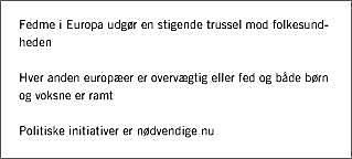 Fedme er fremherskende overalt i Europa, og udviklingen går i retning af amerikanske tilstande. Denne fedmeepidemi, som nu også dukker op hos børn, har ført til en lignende stigning i forekomsten af type 2-diabetes og andre alvorlige fysiske og psykosociale problemer. Byrden på sundhedsbudgettet er blevet stor, og der må derfor gøres noget nu. Både forebyggelse og behandling er vigtige, og indsatsen mod børnefedme skal have høj prioritet. Såvel adfærd som miljø skal ændres for at opnå gode kost- og motionsvaner. Sundhedskampagner, differentierede afgifter på fødevarer, samarbejde mellem industri og sundhedssektor, uddannelse af sundshedspersonale og etablering af rådgivningscentre er alle tiltag, der kan være med til at reducere fedmeprævalensen.