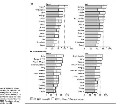 I Europa er der store regionale forskelle såvel som forskelle kønnene imellem (Figur 1 ) [1]. I almindelighed er der færre overvægtige kvinder end mænd. Hvis man kendte årsagen til de regionale forskelle mht. forekomsten af fedme, kunne man måske i højere grad være i stand til at bekæmpe fedmeepidemien. Lavere social status samt lavere uddannelsesniveau er også sammenfaldende med fedme. Fedme er derfor et samfundsmæssigt problem, som både skyldes og er skyld i social ulighed.