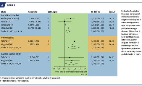 Der foreligger nu en række undersøgelser, hvor man har anvendt mendelsk randomisering til at belyse spørgsmålet om, hvorvidt fedme giver hjerte-kar-sygdom [24, 25, 32, 33]. Disse studier viser tilsammen, at genetisk højere BMI øger risikoen for både iskæmisk hjertesygdom og hjertesvigt samt muligvis også iskæmisk cerebralt infarkt (Figur 3).