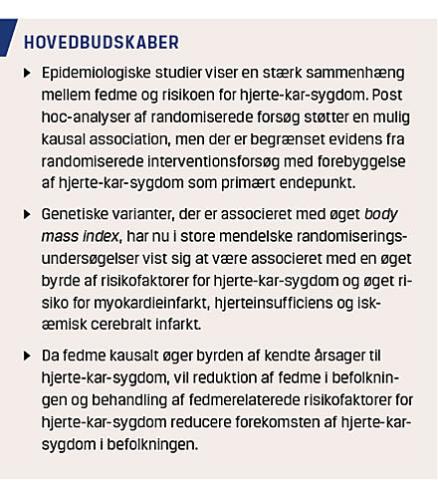 I denne artikel vil vi derfor primært undersøge sammenhængen mellem hjerte-kar-sygdom og BMI frem for andre fedmemål og specifikt undersøge, om sammenhængen er kausal. Selv om der fokuseres på iskæmisk hjertesygdom, iskæmisk cerebralt infarkt og kardiovaskulær død, skal det bemærkes, at der er fundet en epidemiologisk sammenhæng mellem fedme og risiko for andre hjerte-kar-sygdomme (Tabel 1).