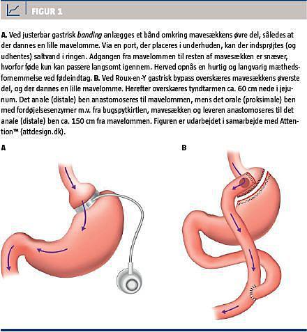 De fedmekirurgiske indgreb kan overordnet inddeles efter, om indgrebet er rent restriktivt, eller om der ved indgrebet opnås en kombination af restriktivt fødeindtag og en grad af malabsorption. Blandt de rent restriktive indgreb hører blandt andet gastrisk banding, sleeve-gastrektomi og anlæggelse af ventrikelballon, mens gastrisk bypass og biliopankreatisk diversion er de mest almindelige kombinerede indgreb. På grund af en øget tendens til massiv malabsorption og risiko for leverskade udføres biliopankreatisk diversion kun sjældent [7], hvorfor gastrisk bypass er det hyppigst udførte kombinerede indgreb. Gastrisk bypass er endvidere den eneste tilgængelige procedure med langtidsopfølgning [6]. Gastrisk banding er det mest almindelige rent restriktive indgreb, men det udføres på grund af mindre vægttab og flere komplikationer langt sjældnere end gastrisk bypass og kun hos udvalgte patienter. Sleeve-gastrektomi og anlæggelse af ventrikelballon udføres sjældent, og der findes ikke studier med langtidsopfølgning. I Figur 1A og B er de to hyppigst udførte indgreb, gastrisk banding og gastrisk bypass, skitseret.