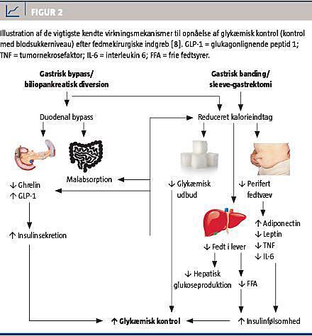 Da de kirurgiske indgreb er forskellige, er virkningsmekanismerne i forhold til vægttab og remission af type 2-diabetes også forskellige (Figur 2). Ved gastrisk bypass passerer føden ikke igennem duodenum, og de første ca. 60 cm af jejunum ekskluderes også. Dette fører i sig selv til en grad af malabsorption. Herudover har de anatomiske ændringer vist sig at føre til ændringer i sekretionen af forskellige tarmderiverede hormoner. Blandt andet mindskes sekretionen af ghrelin fra celler i ventriklens fundusdel, hvilket reducerer appetitten [9, 10]. Endvidere influeres produktionen af de såkaldte inkretiner [11], hvoraf glukagonlignende peptid 1 (GLP-1) synes at være den vigtigste. GLP-1 produceres i de intestinale L-celler [12] og medfører øget insulinproduktion samt nedsat glukagonproduktion [13]. D ette menes at reducere kalorieindtaget yderligere og kan derved forbedre den glykæmiske kontrol (dvs. kontrol med blodsukkerniveauet) direkte, med lavere niveau af glykeret hæmoglobin (HBA1c) til følge. Hvordan GLP-1-sekretionen påvirkes, vides endnu ikke med sikkerhed, og forskellige teorier undersøges i disse år. Ifølge fortarmsteorien produceres der i de proksimale tarmafsnit et endnu uidentificeret antiinkretin, hvis aktivitet bl.a. medfører øget insulinresistens. Bypass af de proksimale tarmafsnit mindsker ifølge teorien dette antiinkretins aktivitet [14]. Ifølge den alternative bagtarmsteori fører øget tilstedeværelse af næringsstoffer i den distale ileum til øget GLP-1-produktion [15]. For de rent restriktive procedurer er nedsat fødeindtag den primære mekanisme. Det reducerede fødeindtag resulterer i et nedsat kalorietilbud, og dette kan direkte forbedre den glykæmiske kontrol. Færre indtagne kalorier fører derudover til mindre fedt i leveren, hvilket igen nedsætter den hepatiske glukagonproduktion og reducerer mængden af frie fedtsyrer i blodet, hvilket igen øger insulinfølsomheden [16]. Endelig resulterer det nedsatte kalorieindtag i en reduktion af det perifere fedtvæv, hvilket igen øger det cirkulerende niveau af adiponectin, mens niveauerne af leptin, tumornekrosefaktor og interleukin 6 reduceres [17, 18]. En forskydning af disse niveauer øger insulinfølsomheden, hvilket igen forbedrer den glykæmiske kontrol.