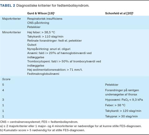 Gurd & Wilsons kriterier (Tabel 2) er p.t.guldstandardi diagnostikken af FES [19]. De påpeger, at enten mindst to majorkriterier eller et major- og fire minorkriterier skal være til stede, for at man kan stille diagnosen. Schonfeld kom med et andet diagnostisk system i 1983 [20], hvor en score på 5 eller derover bekræfter diagnosen (Tabel 2). Ingen af de anførte systemer er validerede, men de klassiske symptomer bør kendes af sundhedspersonale i såvel primær- som sekundærsektoren og videreformidles til patienterne, så de ved, hvornår de skal henvende sig. FES er en eksklusionsdiagnose, og man bør derfor først udelukke de mere hyppige differentialdiagnoser såsom postoperativ lungeemboli (LE) og pneumoni.