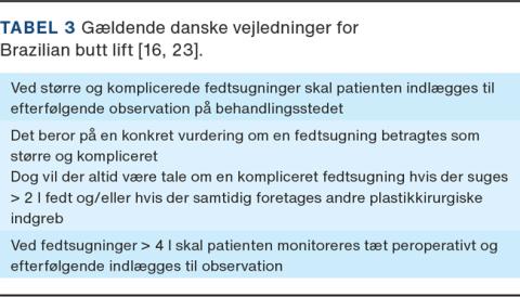 Dette sker i første omgang ved en omhyggelig udvælgelse af egnede patienter til fedtsugning og fedtinjektion (ikkerygere og patienter med god hudkvalitet) samt anvendelse af korrekte operationsteknikker [3, 5]. Patienterne skal under og efter en større/kompliceret fedtsugning og fedtinjektion monitoreres tæt og evt. forblive indlagt i det første postoperative døgn [10, 16]. De gældende danske vejledninger for BBL er oplistet i Tabel 3.