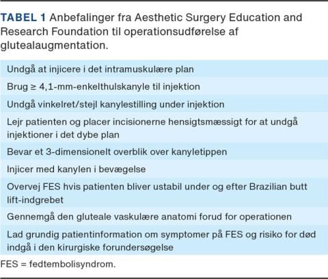 Som anført, er der på globalt plan i de senere år rapporteret om en række fatale og nonfatale tilfælde af FES i forbindelse med BBL – en procedure, som samtidig er vokset voldsomt i popularitet [2]. I alt 413 mexicanske plastikkirurger har rapporteret om 64 dødsfald relation til fedtsugning i løbet af de seneste 15 år, og 13 af disse dødsfald skete pga. gluteal fedtinjektion. I Columbia blev der ligeledes rapporteret om ni dødsfald over en periode på ti år [8]. I en større systematisk gennemgang påpegede man derfor vigtigheden af, at indgrebet kun bliver foretaget af højtspecialiserede plastikkirurger, der har et dybtgående kendskab til glutealregionens topografi og indgrebets teknikker [9]. Aesthetic Surgery Education and Research Foundation nedsatte en specialenhed, som bestod af plastikkirurger, patologer og statistikere, der fik til opgave at undersøge FES-komplikationerne og give anbefalinger for at minimere risikoen, og resultaterne udkom i en rapport i 2017 [5]. Forfatterne udsendte detaljerede spørgeskemaer og interviewede aktive medlemmer af American Society of Aesthetic Plastic Surgeons samt The International Society of Aesthetic Plastic Surgeons, og på baggrund af disse data sammenholdt med den eksisterende litteratur samlede de en række anbefalinger, der i dag betragtes som guldstandard ved glutealaugmentation (Tabel 1).
