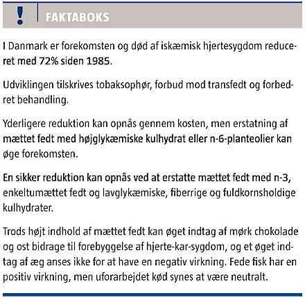 Reduktion af mættet fedt har været en hjørnesten i forebyggelsen af CVD og byggede initialt på Keys fund af sammenhængen mellem indtag af mættet fedt og IHD-mortalitet i forskellige lande [10]. Senere er det især risikomarkører, som total- og lavdensitets-lipoproteinkolesterol, der er blevet anvendt, selvom det er erkendt, at disse er utilstrækkelige [11]. Store systematiske gennemgange af de observationelle studier og interventionsstudier med hårde endepunkter har ikke sikkert underbygget, at en reduktion af mættet fedt har spillet en væsentlig rolle. Ernæringsrådet konkluderede i 1995: »I flere årtier har øget indtag af n-6-flerumættet fedt som erstatning for mættet fedt været en væsentlig faktor i kostprincipper rettet mod såvel primær som sekundær forebyggelse af iskæmisk hjertesygdom. Resultaterne af de i dag tilgængelige sekundære forebyggelsesundersøgelser støtter ikke dette kostprincip« [12]. Det var især interventionsstudier, som gav mistanke om en manglende positiv effekt. I et Cochranereview af studier med hårde endepunkter konkluderede man i 2004, at kostændringer med nedsættelse eller modificering af kostens fedtindhold ser ud til at reducere forekomsten af CVD [13]. Dette er statistisk signifikant for studierne