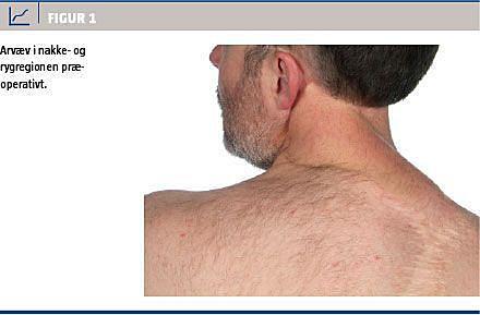 I 2011 blev patienten henvist til en plastikkirurgisk afdeling grundet tiltagende smerter i cikatricerne i regio nuchalis og den torakale ryg. Patienten beskrev stramning over cikatricerne. På en visuel analog skala (VAS) scorede patienten 8 i hvile og funktion. Patienten kunne udføre daglige gøremål som vask, tandbørstning m.fl. med smerter. Han kunne ikke dyrke sport. Han arbejdede som konsulent, men tog mange og lange pauser på grund af koncentrationsbesvær. Tbl. paracetamol 1 g × 4 dagl. og ibumetin 400 mg × 2 dagl. var uden større effekt på smerterne. Patienten ønskede ingen yderligere medicinering. Objektivt fandt man ensidig indskrænket bevægelighed i nakken ved hoveddrejning, kraftig arvævsdannelse og nedbinding af arvæv til underliggende periost (Figur 1).