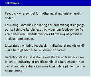 Traditionelt har de uddannelsessøgende lært disse færdigheder af erfarne læger i en slags mesterlære. Men denne tradition er nu i stigende grad blevet suppleret med undervisning på færdighedslaboratorier, hvor medicinstuderende og læger kan træne i simulerede omgivelser [1]. Med denne tendens er der opstået nye muligheder for forskning med henblik på at forbedre træningen af praktiske kliniske færdigheder. Der har igennem flere årtier været en generel opmærksomhed omkring feedbacks centrale rolle i den medicinske uddannelse [2, 3]. Der har imidlertid være mindre opmærksomhed på teorier om indlæring af motoriske færdigheder, inden for hvilke feedback er identificeret som en af de vigtigste parametre for en effektiv læring [4, 5].