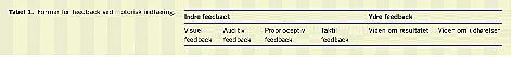 Feedback i forbindelse med motorisk indlæring inddeles i indre og ydre feedback (Tabel 1 ). Den indre feedback er de sensoriske informationer, som sanseapparatet giver, når man udfører en motorisk færdighed, og de vil dermed altid være til stede. Dette er ikke tilfældet for den ydre feedback, som kommer fra en ekstern kilde og forstærker eller supplerer den indre feedback. Traditionelt har den ydre feedback været verbal, men nye teknologier giver andre muligheder. F.eks. har videooptagelser længe været anvendt som feedbackredskab, og computerteknologi gør det nu muligt at registrere bevægelsers kinematik og præsentere disse informationer på forskellig vis. Uanset formen er den ydre feedback overordnet en af to typer. Viden om resultatet giver informationer om udfaldet af den motoriske udførelse. Viden om udførelsen giver informationer om bevægelserne i udførelsen [4, 5].