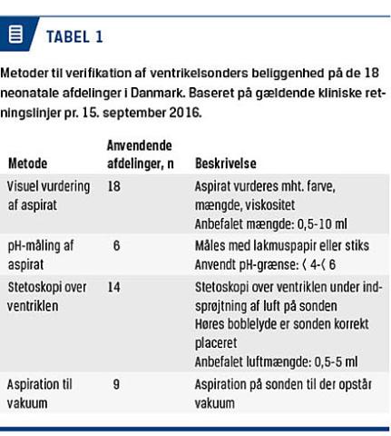 På alle landets neonatalafdelinger har man retningslinjer for anlæggelsen, men indholdet varierer (Tabel 1). Aspiration på VS med visuel inspektion af aspiratet anvendes hyppigst, men det er en usikker metode til skelnen af sekret fra bronkier og ventrikel [2]. Aspiration på VS, til der opstår vakuum, kan ses ved knæk på sonden, eller hvis sondespidsen suger sig fast i slimhinden andre steder end i ventriklen. Luftinfusion i sonden under auskultation over ventriklen er tidligere hyppigt brugt, men frarådes nu [1], da lyden kan transmitteres til epigastriet, uanset hvor VS er placeret.