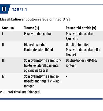 Undersøgelse af en boutonnièredeformitet bør omfatte en standardrøntgenoptagelse for at se efter et eventuelt avulsionsfragment (af traumatisk årsag) og for at vurdere eventuelle artrose- eller artritisforandringer. To forskellige klassifikationssystemer har været brugt ved boutonnièredeformitet, Burton I-IV (efter traumer) [8], eller Nalebuff I-III (ved RA) (Tabel 1) [9].