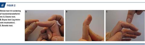 Elsons test anvendes til diagnosticering eller udelukkelse af en boutonnieredeformitet [7]. Undersøgeren holder PIP-leddet i 90 graders fleksion, og patienten skal ekstendere DIP-leddet (Tabel 1). Ved intakt ekstensormekanisme afslappes LB og forskydes distalt, hvilket umuliggør en aktiv ekstension i DIP-leddet. Ved en boutonnièreskade forskydes LB ikke distalt, hvorfor tensionen i den terminale sene øges, og DIP-leddet kan ekstenderes.